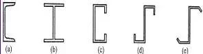 4、卷边Z形冷弯薄壁型钢檩条:分直卷边Z形(图d)和斜卷边Z形(图e)。它的主平面x轴的刚度大,用作檩条时挠度小,用钢量省,制造和安装方便。斜卷边Z形钢存放时还可叠层堆放,占地少。当屋面坡度较大时,这种檩条的应用较为普遍。