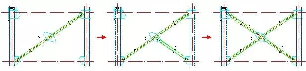 柱间支撑与钢柱采用节点板螺栓连接和焊接连接相结合的方式,制作及钢柱安装偏差对其安装可能有较大的影响,柱间支撑在工厂内整榀拼装完后整体运输到现场进行安装。柱间支撑吊装重量较轻,可以利用25吨汽车吊进行吊装。