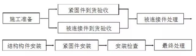 f)螺栓的安装应在结构构件中心位置调整完毕后进行,其穿入应以施工方便为准,并力求统一,同一节点不允许出现螺栓安装方向不一致的现象,同一构件两端的螺栓安装方向应一致,同一轴线上构件节点的螺栓安装方向应一致,同一框架、同一装置的结构构件的螺栓安装方向宜一致,个别节点由于安装不便等原因可不按照以上要求施工;一般来说为美观起见,外侧结构的构件的螺栓安装时应是螺栓头在外侧;